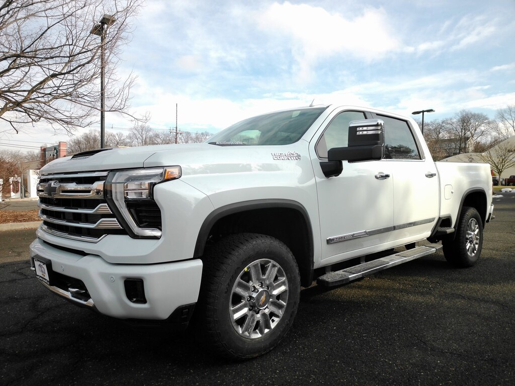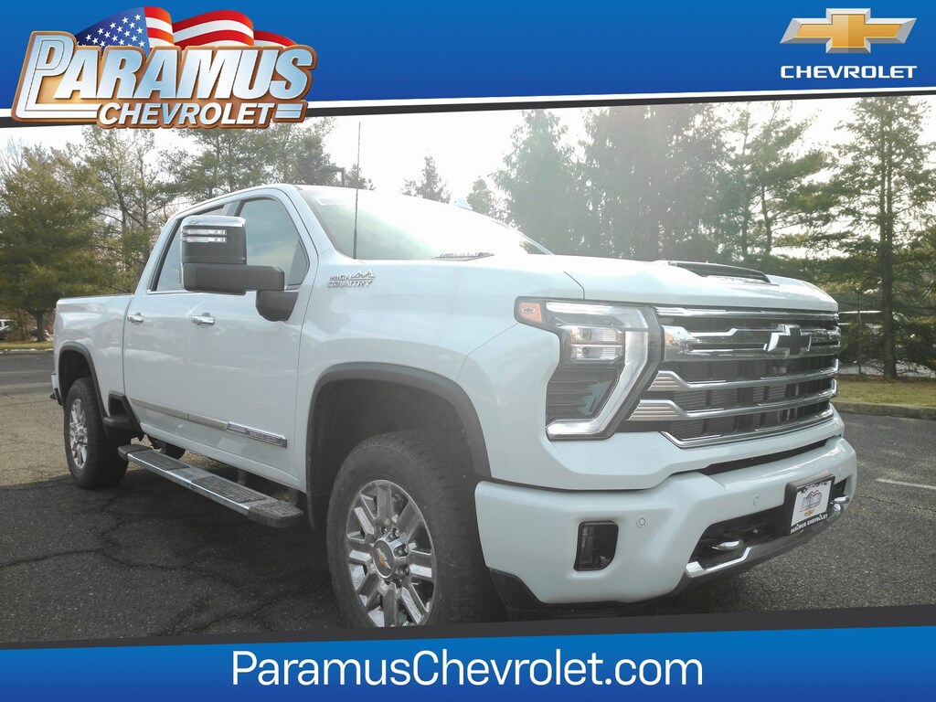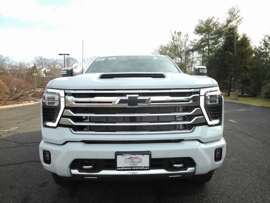 Polar White Tricoat 2026 Chevrolet Silverado 2500HD High Country 4WD 10-Speed Automatic Duramax 6.6L V8 Turbodiesel 10-Speed Automatic, 4WD, Jet Black / Nightshift Blue Leather.